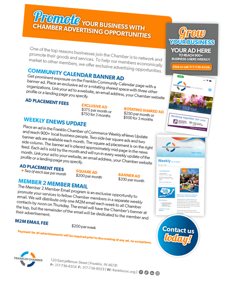 Studies show that belonging to the Chamber is a great investment for your business, but it’s up to each member to take advantage of the benefits. The Franklin Chamber of Commerce offers the following as part of membership at no added cost.